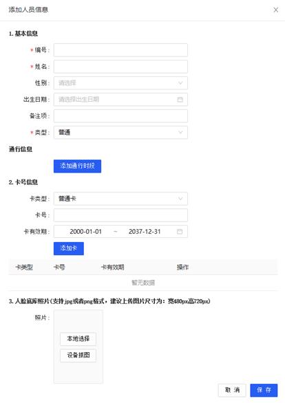 添加:点击添加按钮,弹出添加人员信息填写框,通过填写编号、姓名、性别、出生日期、备注项、类型、卡号、卡有效期、照片上传选择类型,本地上传和设备抓拍等操作完成人员信息填写,具体界面: