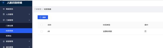 时段信息功能可对整个设备,每天允许通行的时段进行设置,默认为全通行,该功能目前已被权限组替代,web页面已经关闭设置