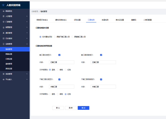 3. 口罩检测:可配置口罩检测以及口罩对应的通行方案,也可在其配置相关文字以及语音提示内容,其中,选择【屏蔽不戴口罩人员】时,如果检测到人员没戴口罩,将不开门;选择【屏蔽戴口罩人员】时,如果检测到人员戴口罩,将不开门;