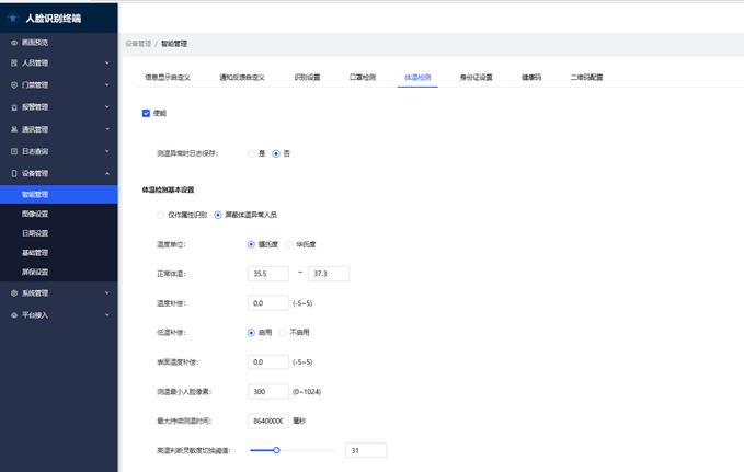 4. 体温检测(仅测温款支持):可配置温度相关的通行方案,也可在其配置相关文字以及语音提示内容