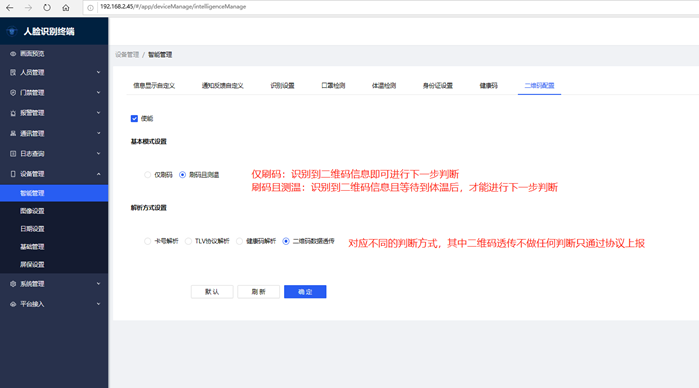 6. 二维码配置:可配置扫码与测温业务强关联,也可以仅配置扫码数据透传或解析识别