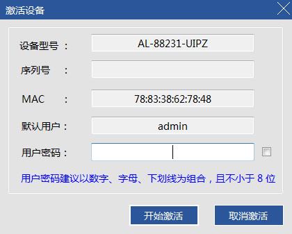 激活设备时,设备的默认用户是管理员用户 admin,需要设置用户密码,点击开始激活后,设备能够被激活。
