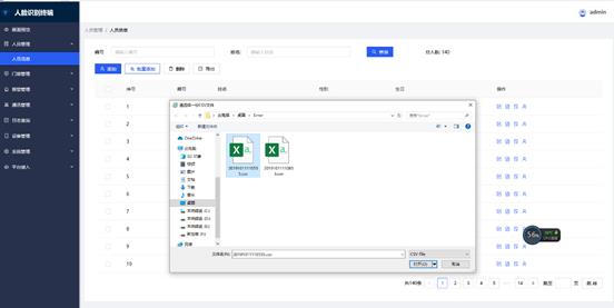 批量添加:弹出导入模式选择:智能导入模式和极速导入模式,按照要求选择导入模式,点击“确定”按钮,弹出人员信息选择对话框,选择包含人员照片和人员信息的CSV文件,点击“打开”,弹出人员信息导入进度提示框。