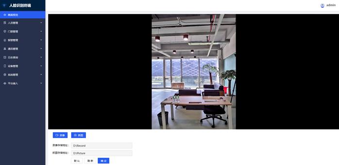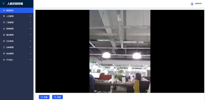 上图左侧列表显示功能有:画面预览、人员管理、 门禁管理、报警管理、通讯管理、日志查询、设备管理、系统管理、平台接入。