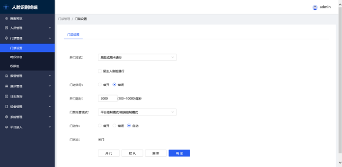 3, 门动作:就是设备识别后的状态默认选项为自动,可选择为常开过常闭。