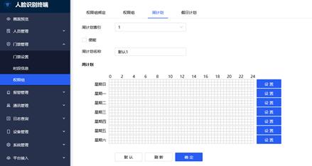 1, 设置周计划:即设置每周通行的计划,如学校场景下,可设置学生周计划表,周一到周五上下学时间允许通行,周六周日不可通行