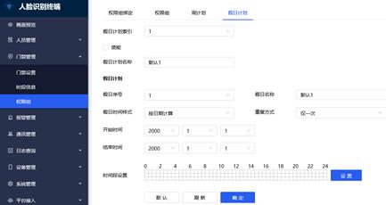 2, 设置假日计划:在周计划之前可另外设置特殊时间,如学校场景下,可设置学生假日计划,在国庆、五一等假日时,即使不在周计划的通行时段内,也可以放行