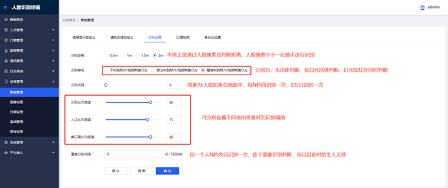 3.识别设置:可配置识别距离(0.5/1/1.5/2m),识别等级(即是否检测活体),识别间隔(每秒识别次数,0就是整个过程只识别一次),以及人脸比对阈值以及人脸口罩比对阈值设置