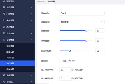 如下图,可对设备的设备名称、音量、屏幕亮度、白光灯亮度、红外灯、进入屏保时间、进入息屏时间进行设置