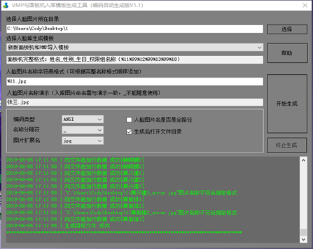 点开人员人脸入库模板生成工具(编号自动生成版),选择人脸库目录,人脸库生成模板选择新版面板机和VMP导入模板,根据你人脸图片命名修改人脸命名字符串格式,点击开始生成,即可生成CSV引导文件;