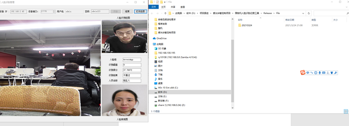 连接后如上图, 左边可以看到实时图像,右边可以接收到人脸抓拍照片、比对底库和比对参数,其中: